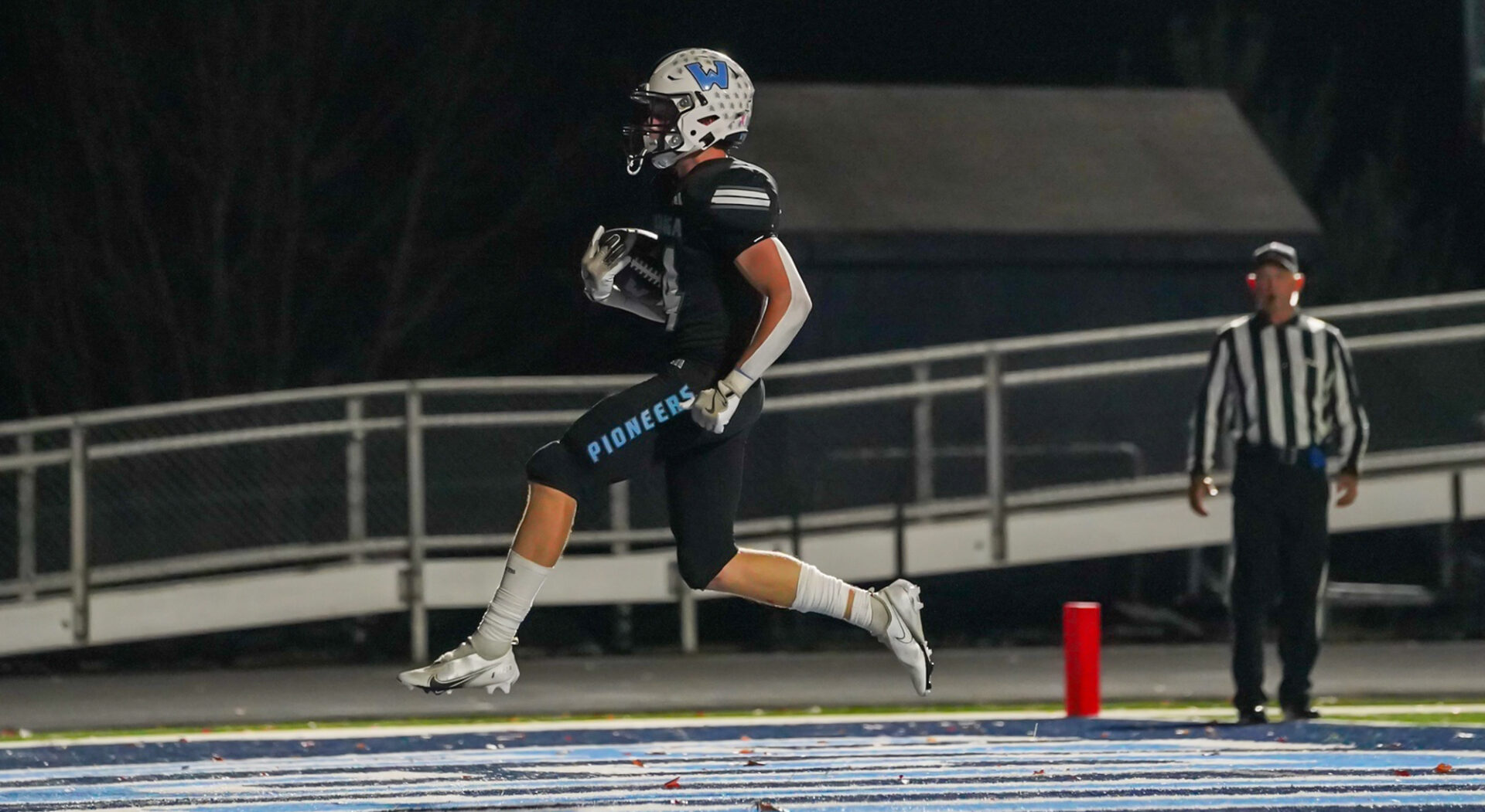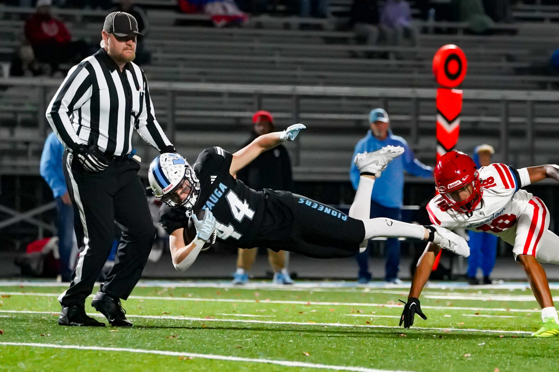 The Pioneers’ senior quarterback Maddox Greene was again the game’s leading rusher, with 11 carries for 99 yards and two TDs. He also completed five of seven passes for 51 yards and another TD. Through this Nov. 1 game vs. Freedom, Greene has carried the ball 103 times for a net of 919 yards gained rushing — and scored 15 rushing TDs. He has completed 53 of 76 passes (69.7 percent) for 890 yards for another 12 TDs vs. just one interception.