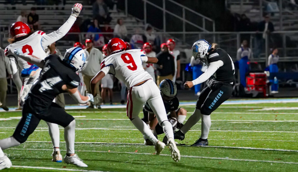 True to form, the Habich-crafted offense dominated time of possession, 21:16 to Freedom’s 16:17. Equally important, when the Pioneers had the football, they did something with it, only punting one time. When Freedom wasn’t punting (three times), they were turning the ball over: two lost fumbles, one pass interception, and two failures to convert in “going for it” on fourth down.