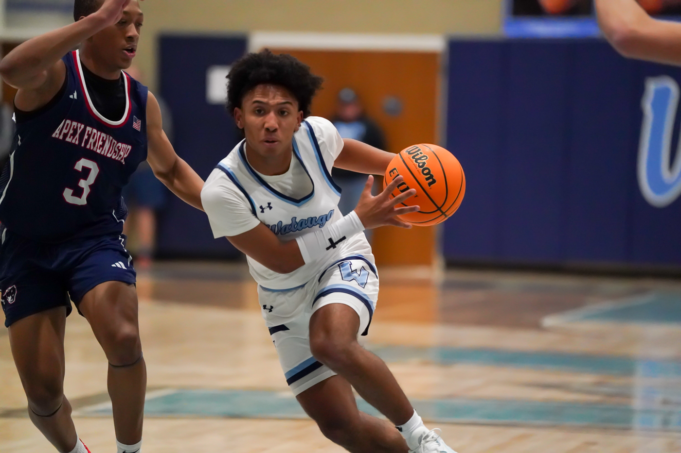 The visiting Patriots’ roster includes five players 6-3 or taller, including the biggest of the bigs, 6-6 senior center/forward Chuks Ezeonu, named most valuable player of the tournament after the game. Ezeonu scored 12 points for Apex Friendship, but had a greater impact on the outcome with his rebounding and blocked shots.