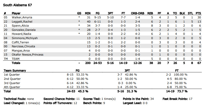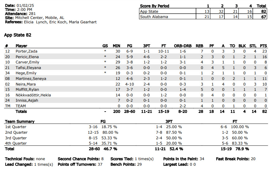 Tafisi opened the fourth quarter with a layup, which Pericic followed up with a pair of free throws to keep the Mountaineers ahead, 70-55. Despite an early scoring drought, Porter sank another set of freebies. Carver also contributed a point from the charity stripe before Porter made a second-chance layup on a fastbreak. Carver knocked down her sole trey of the game to put App State up, 78-64. Neira and Porter made a last pair of layups before sealing the win, 82-67.