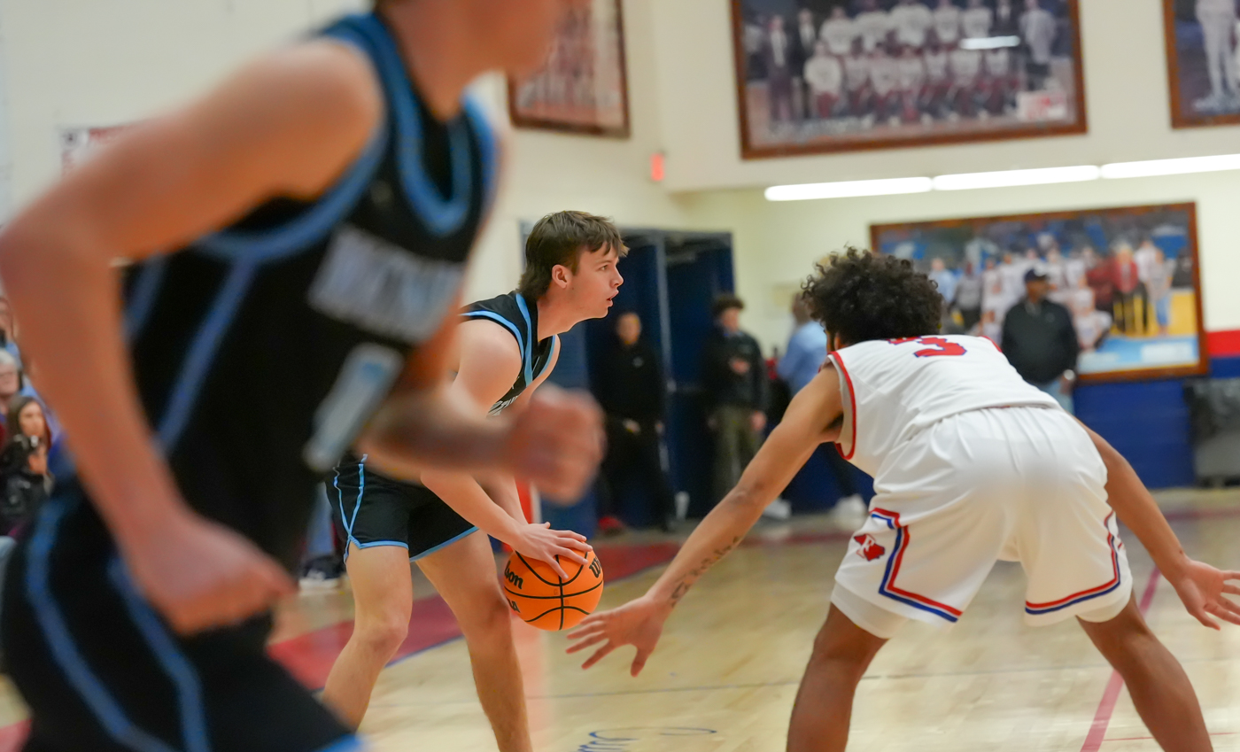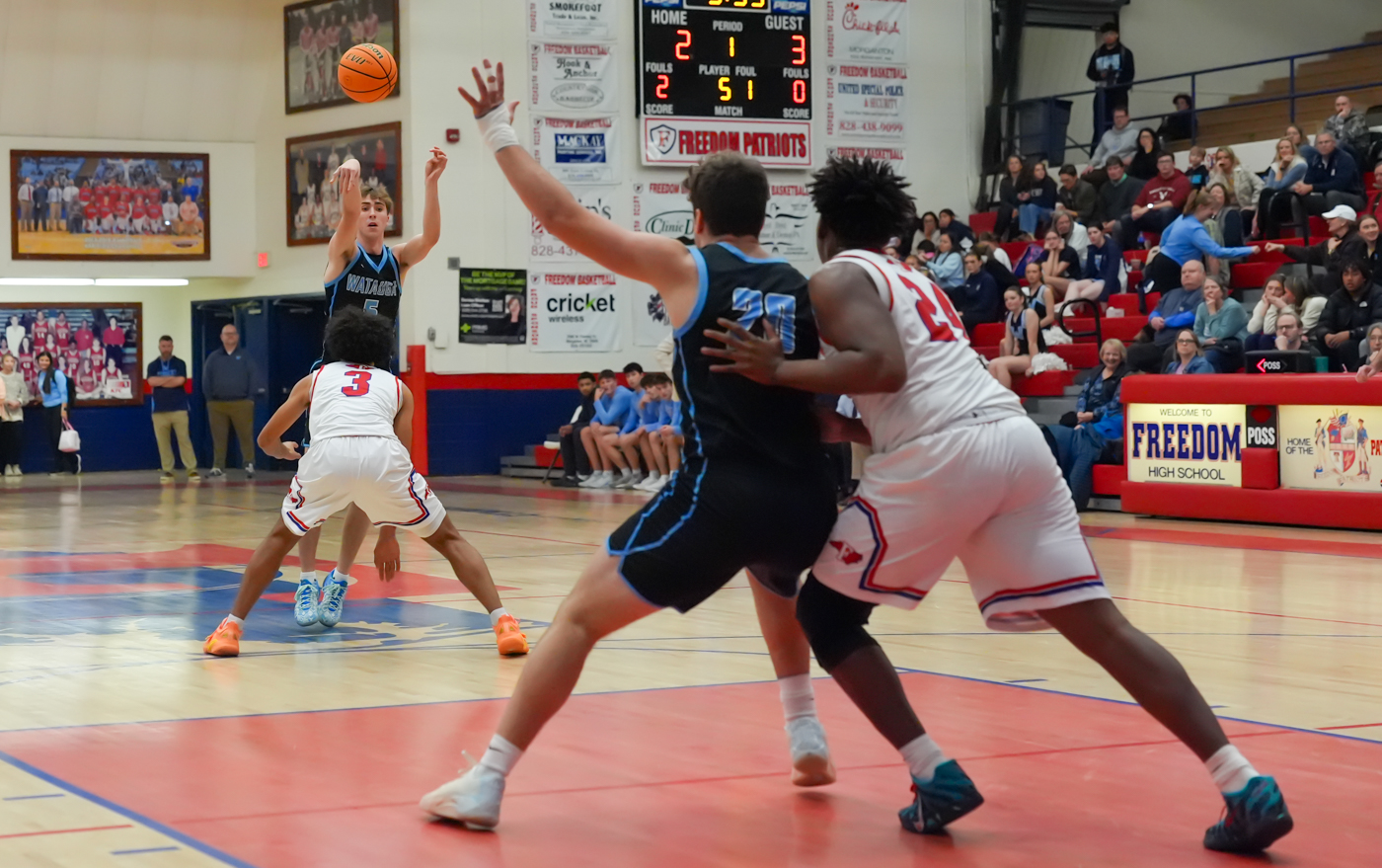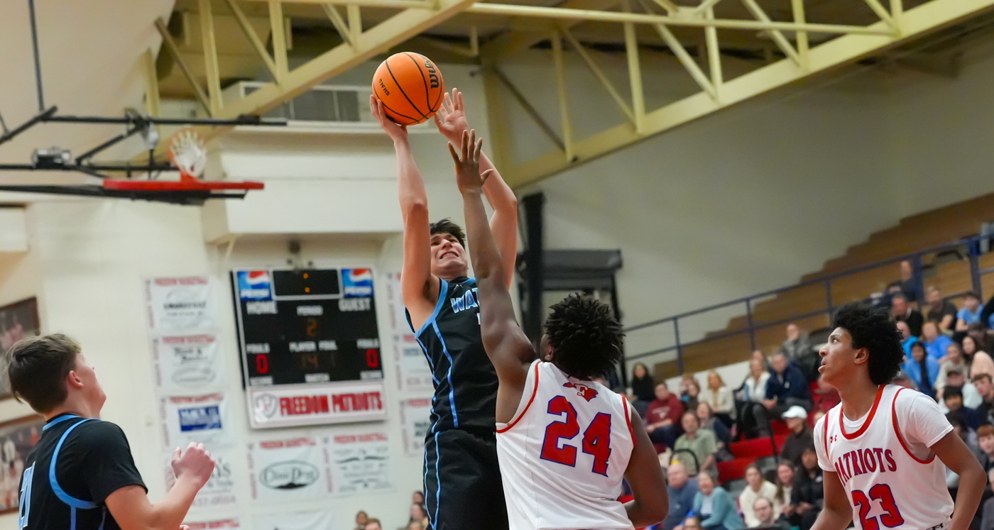 At the end, with under two seconds remaining, Watauga senior Jackson Love had what seemed to be a clean look for a layup from the right side that would tie the game and send it into overtime — but a brilliant play to block by Freedom junior Jaden Watkins, an athletic 6-3 forward, instead sent the ball sailing out of bounds with 0.8 seconds remaining on the game clock and the Pioneers still facing the 2-point deficit. Throwing in from the baseline with Freedom’s towering, 6-7 forward Nate Surrat defending the inbounded pass, the Watauga throw-in was forced long and time expired before a shot could be taken.