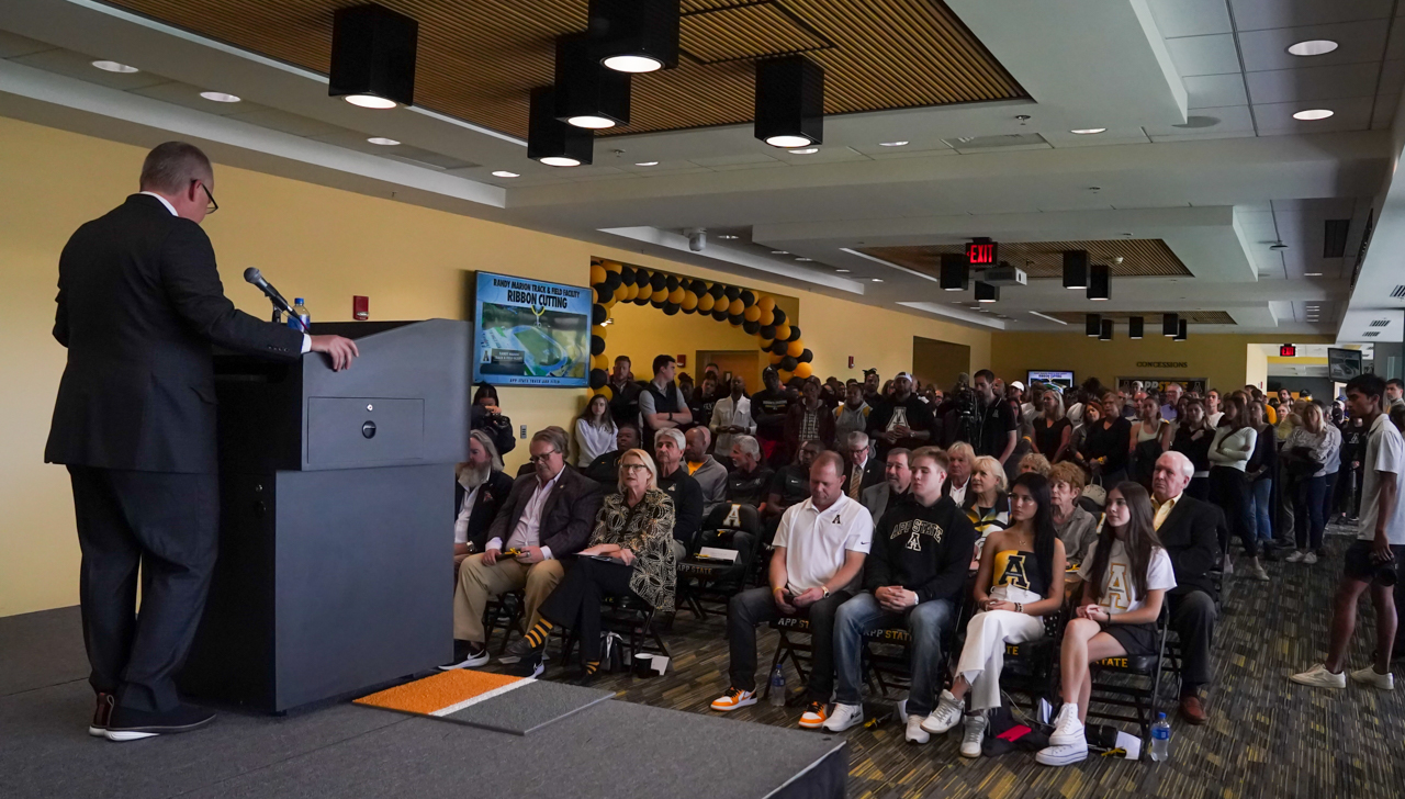 While the ribbon-cutting had been planned for the track and field facility site off of NC Highway 105, the forecasted severe thunderstorm chased the festivities inside, appropriately. Some 250 members of the university and athletic department leadership as well as scores of track program alumni joined in the event.