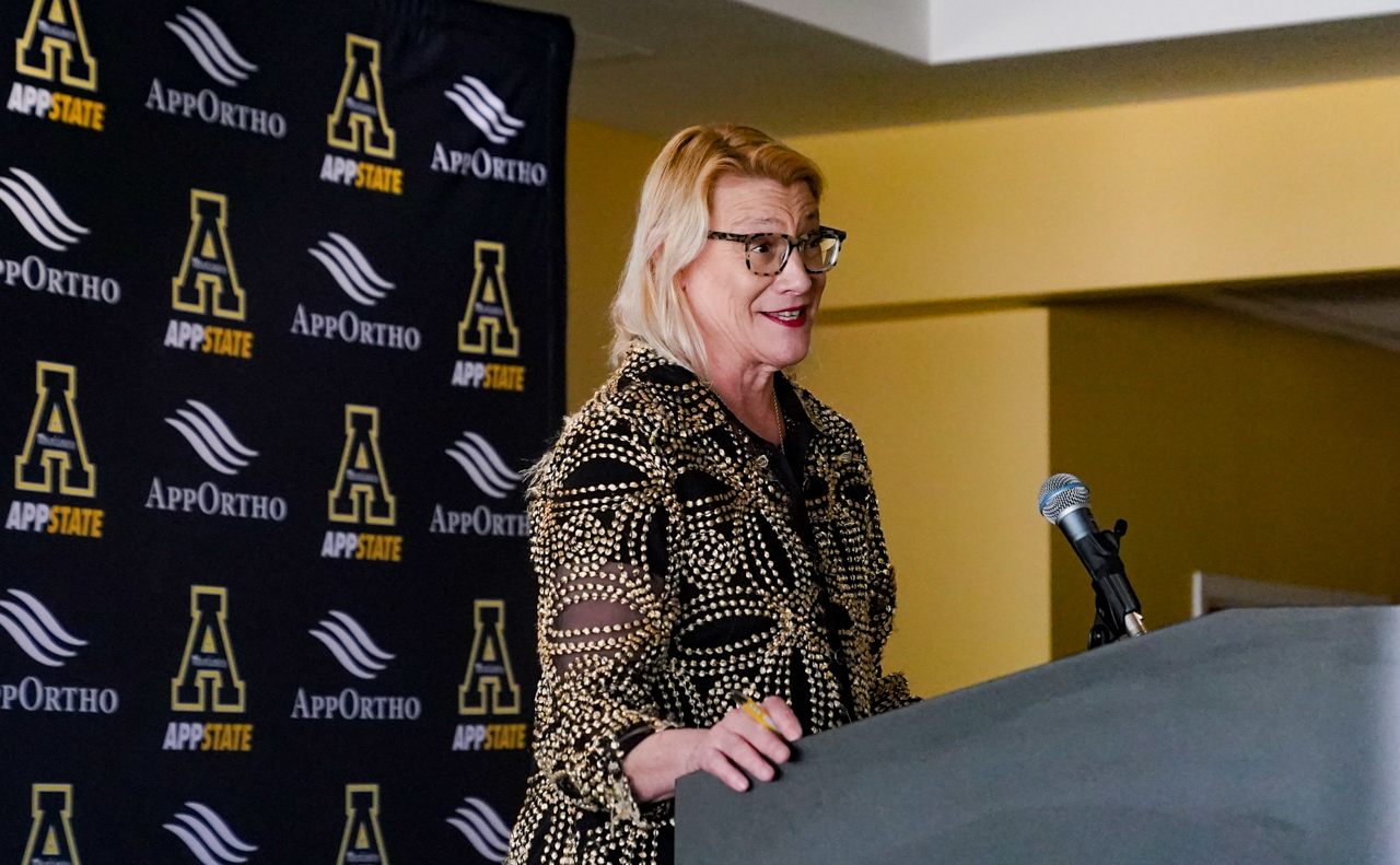 Gillin beckoned Everts to the podium after introducing her as the most passionate App State fan of all the people in the room. “She has always been steadfast in her support of App State student athletes. She came to the university in 2014 as its eighth leader and has helped establish the university as the premier public undergraduate institution east of the Mississippi (River). Under her guidance and leadership, App State regularly earns top rankings for academic excellence and this includes the 21 straight semesters that our student athletes have (collectively) achieved greater than a 3.0 grade point average.”