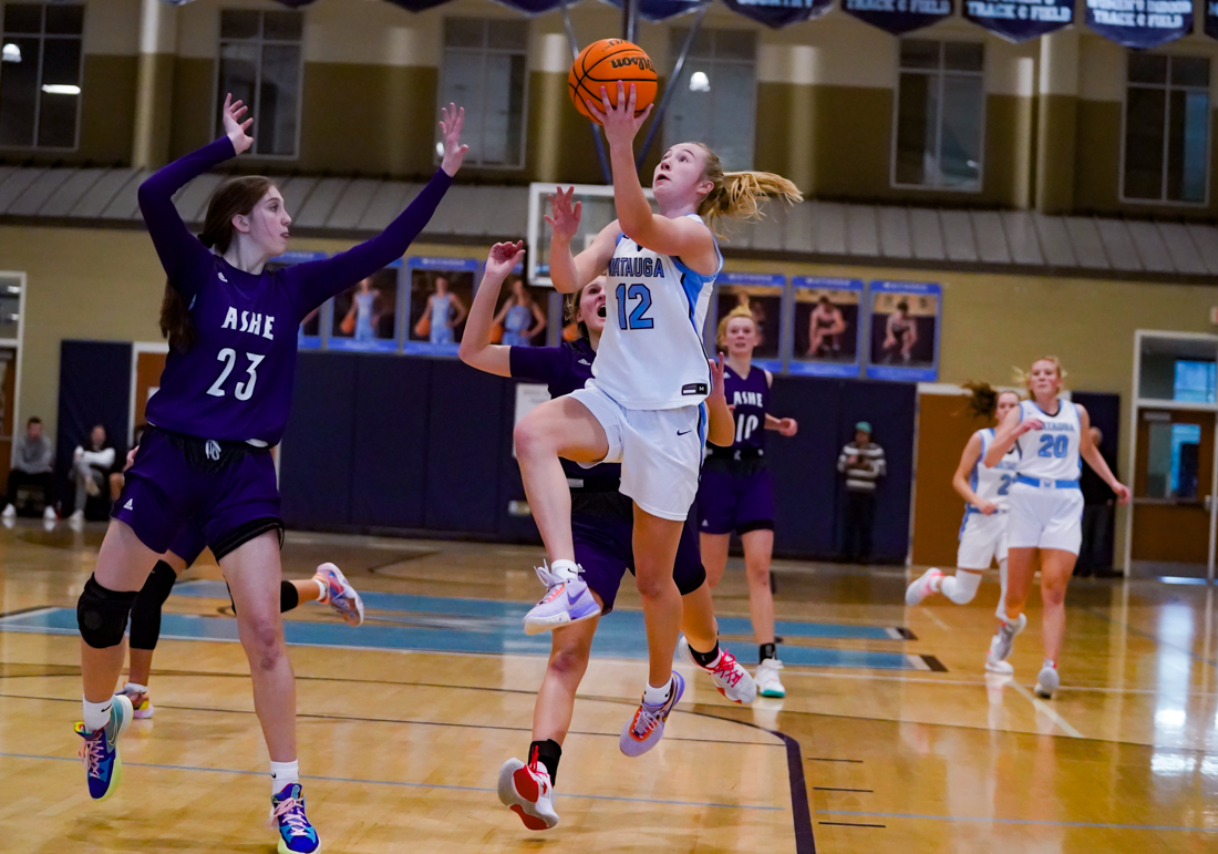 Ashe County took command early behind deadeye shooting by Abigail Jones and Abby Sheets, who together scored 15 of the Huskies first 21 points, propelling their team to a 21-16 lead at the end of the first quarter. The Pioneers caught up, but even at halftime intermission the score was 35-32 in favor of Watauga. And yet, Ashe County would never again lead. Three Huskies, however, scored in double figures, including Abigail Jones and Abby Sheets tying for team-high honors at 14 apiece, with Overcash right behind, with 13 points.