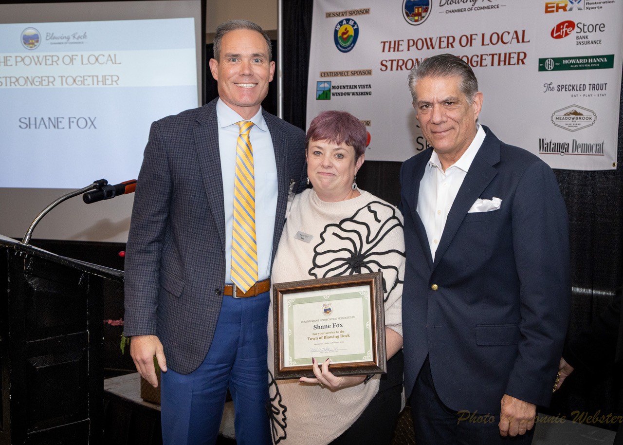 Commissioner Melissa Pickett and Chetola Mountain Resort general manager Albert Mertz joined at the end of the awards presentations to recognize the service to Blowing Rock of Shane Fox, who will leave his position as Town Manager to become Caldwell County’s County Manager on Dec. 1.