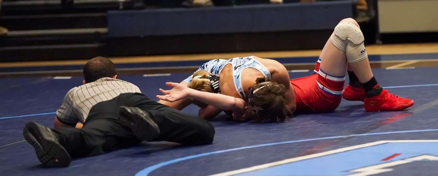 With Watauga opening a 12-0 team lead, it was up to Freedom’s Yaleen Khang, a female freshman, to get the Patriots on the scoreboard and she took care of business in the third period vs. Bryan Chen in the 106 lb. class, pinning the Pioneer sophomore late in the third and final period to cut the team deficit in half, 12-6.