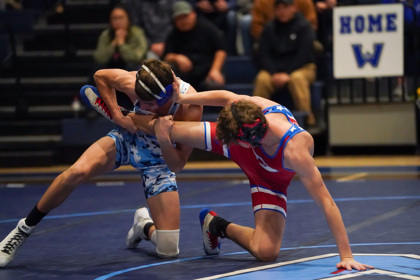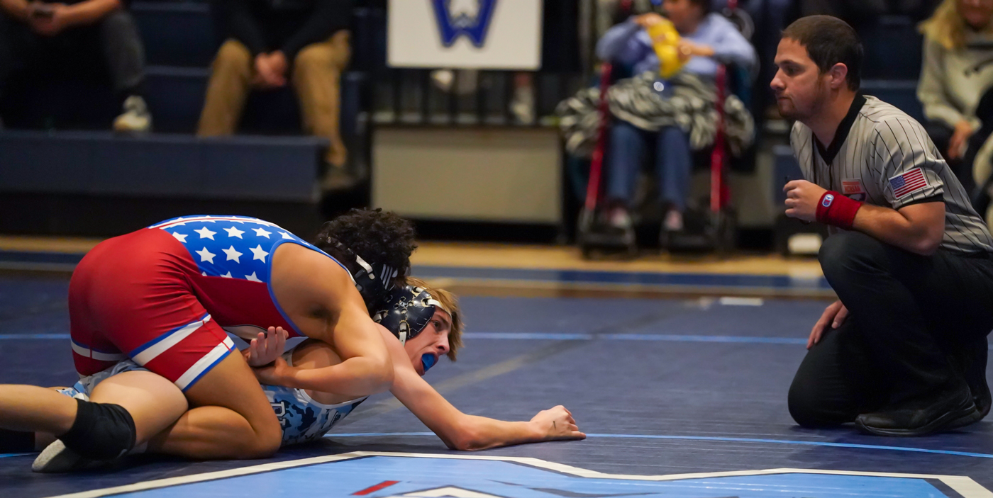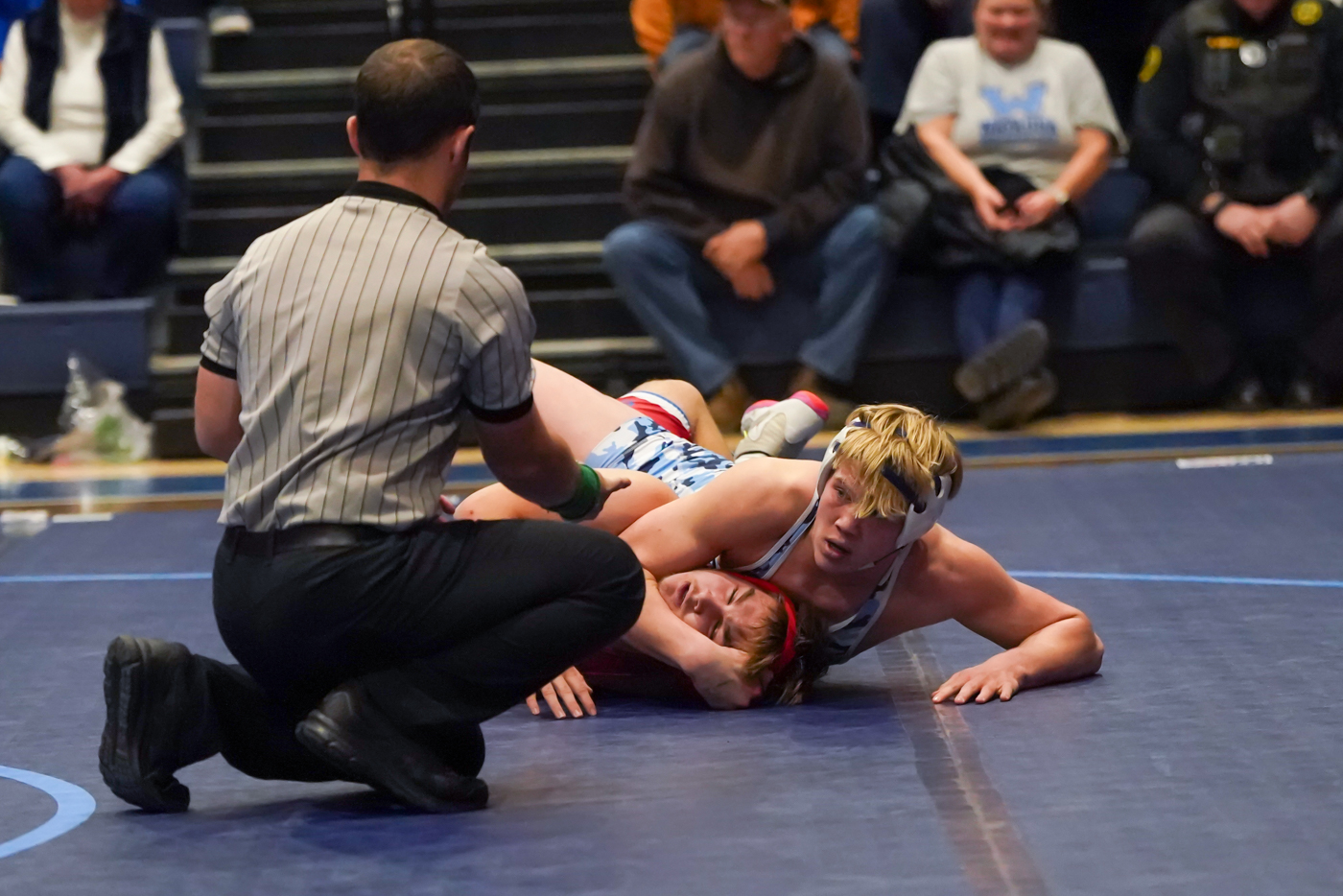 Cole Kleman began a string of Watauga victories vs. Freedom sophomore Hank Hall at 132 lbs., pinning Hall midway through the second period while leading 6-2. The decision by fall extended Watauga’s team lead to 27-9.