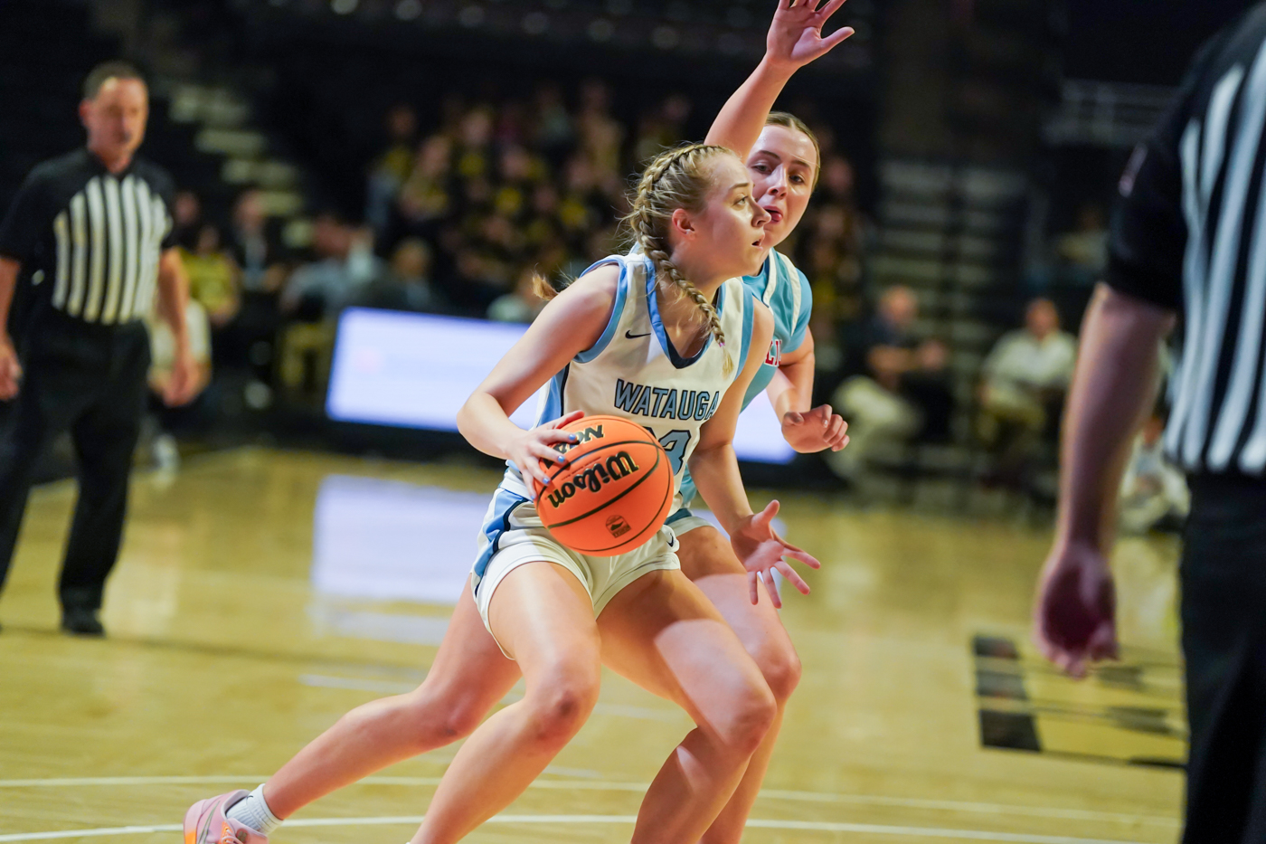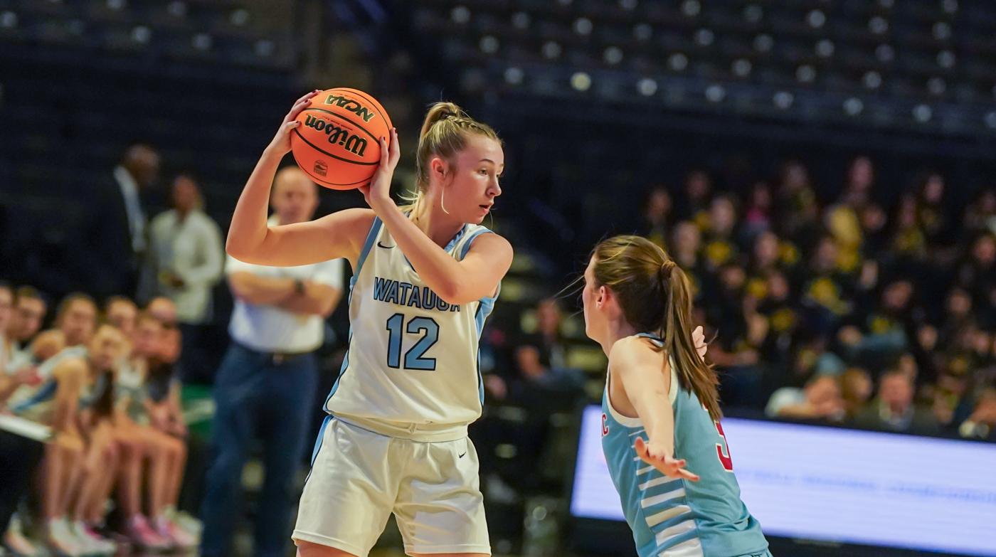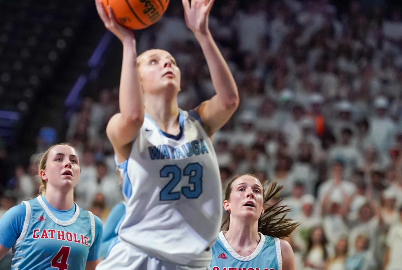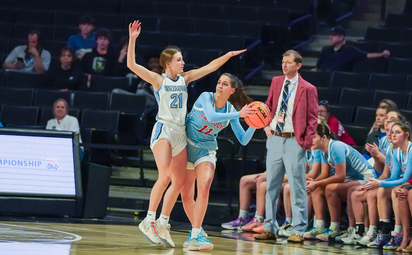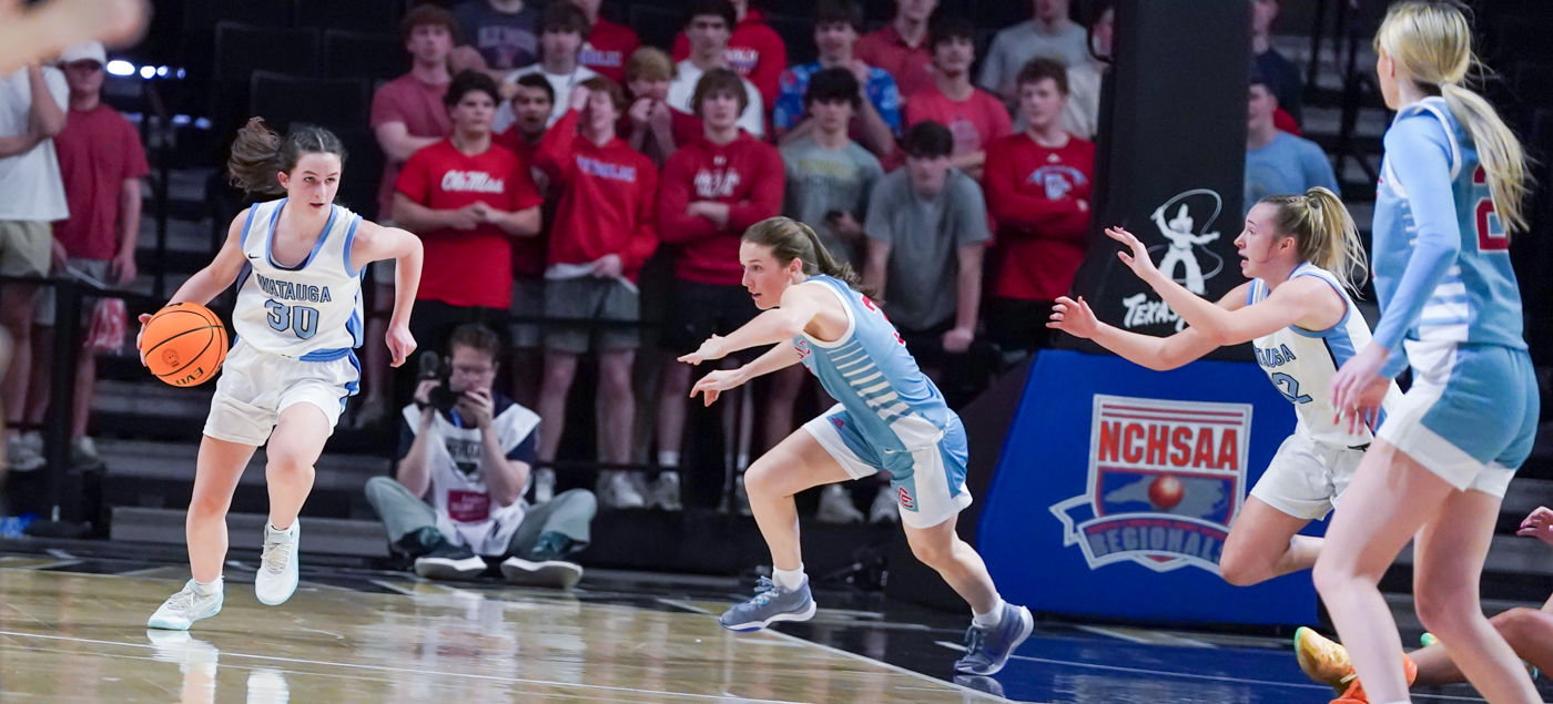By David Rogers. WINSTON-SALEM, N.C. — After falling behind by as many as 11 points in the first half of the NCHSAA 4A West Regional Championship game on March 14, Watauga clawed back to tie Charlotte Catholic at 34-34 early in the second half and even led at 39-38. Unfortunately, the Cougars’ adept 3-point shooting and strong inside play around post player Blanca Thomas kept the Pioneers from extending their momentum. CCHS won, 61-55, at the Lawrence Joel Veterans Memorial Coliseum on the campus of Wake Forest University.