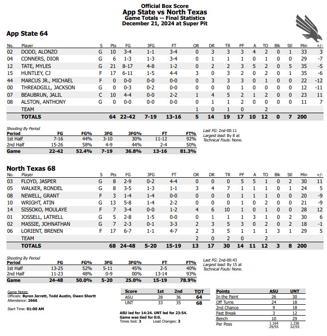 With time running out (only 19 seconds remained when Tate hit on a 3-pointer to close the deficit to 64-62), App State was forced to foul. Unfortunately, the Mean Green’s Jasper Floyd was good on 4-of-4 from the charity stripe in the last 19 seconds, effectively thwarting the Mountaineers’ comeback rally.