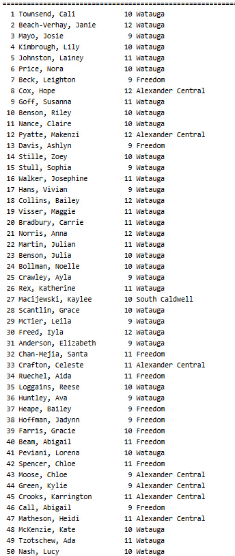 Watauga senior Janie Beach-Verhay was No. 2 (20:54.17), freshman Josie Mayo No. 3 (20:54.46), sophomore Lily Kimbrough No. 4 (21:07.64), junior Lainey Johnston No. 5 (21:07.94), and sophomore Nora Price No. 6 (21:08.42).