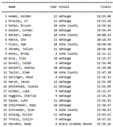 In the Junior Varsity men’s division, Watauga had eight of the top 12 finishers in No. 1 Holden Womak, No. 2 AJ McAuley, No. 4 Cormac Walker, No. 6 Ike Mance, No. 8 Tallon Abrams, No. 10 Cole Gray, No. 11 Caleb Duvall, and No. 12 Andrew Weikert.