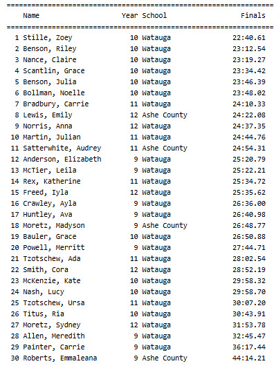 Reflecting the depth of the Watauga cross country roster, the Pioneers swept the first seven spots in the Junior Varsity women’s division: No. 1 Zoey Stille, No. 2 Riley Benson, No. 3 Claire Nance, No. 4 Grace Scantlin, No. 5 Julia Benson, No. 6 Noelle Bollman, and No. 7 Carrie Bradbury. Ashe County senior Emily Lewis was No. 8, just ahead of Watauga’s Anna Norris (No. 9) and Julian Martin (No. 10).