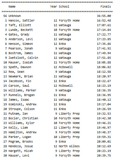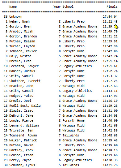 Liberty Prep eighth grader Noah Weber prevailed as No. 1 in the Middle School Boys Division, ahead of a trio of Grace Academy of Boone runners (Evan Gordon, Micah Arnold, and Brandon Gordon). Watauga Middle School’s top performers in the boys division were seventh grader John Braxton at No. 14 and eighth graders Yates Hodges and Kailu Rodli-Bost, No. 16 and No. 18, respectively.