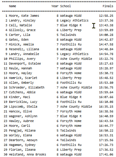 Watauga fared better in the Middle School Girls Division, where eighth grade Kate James Moore dominated as the No. 1, finishing the 2-mile course 39 seconds ahead of her nearest competitor, Legacy Athletics’ Ainsley Landry. Watauga’s Eden was No. 6, while Lilliana Resendiz was No. 8.