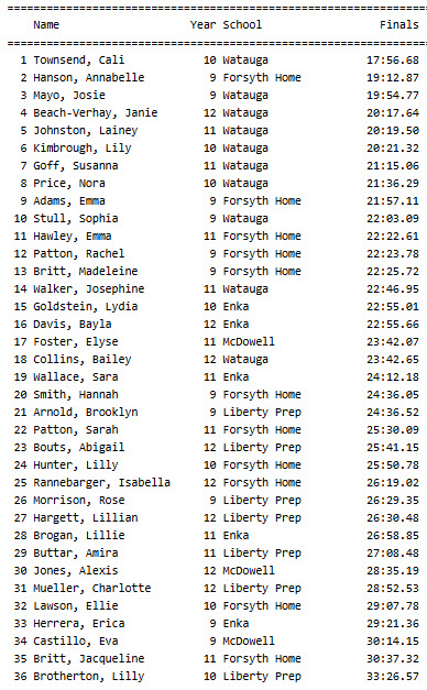 By David Rogers. BOONE, N.C. — Led by sophomore Cali Townsend finishing No. 1, a full minute and 16 seconds ahead of runner-up Annabelle Hanson of Forsyth Home Educators, Watauga High School captured eight of the top 10 spots in the women’s division of the Blue Ridge Mountain Rentals High Country Cross Country Classic on Sept. 27. The course distance was 5,000 meters