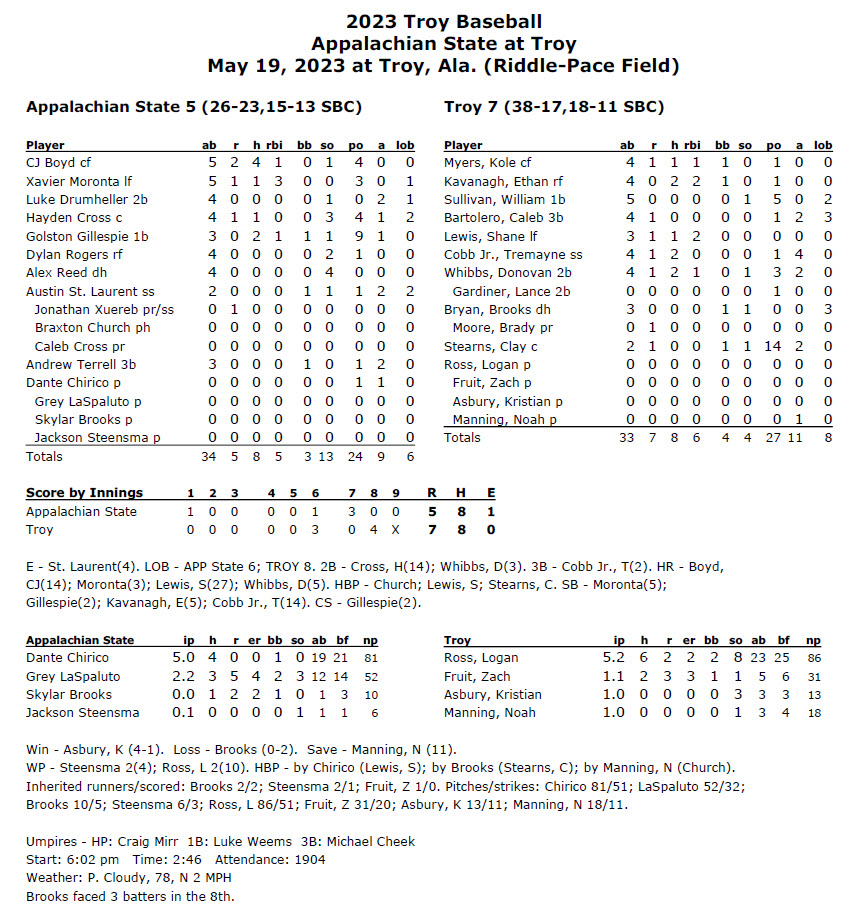 By Matt Present. TROY, Ala. – App State fell to Troy in the middle game of the series at Riddle-Pace Field, 7-5, in a back-and-forth ballgame Friday night.