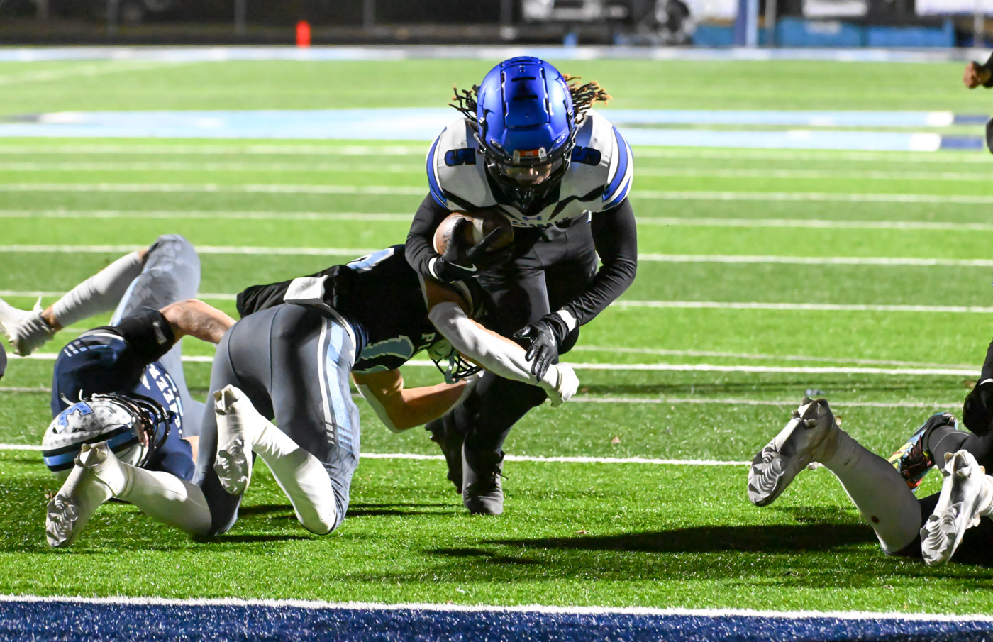 On the Tigers first possession, starting from their own 15 yard line, as expected quarterback Braylon Louis started by handing the ball off to Diggs. The Pioneer defense limited him to two yards on first down then, led by senior defensive lineman Callan Riordan, the Pioneers tackled Diggs for a 7-yard loss. Pinned back on his own 10-yard line, Louis looked to pass down the left sideline, which is where the Pioneers’ defensive back Nyle Peays swooped in to pluck the ball in midair and race 24 yards to the end zone for a “pick six.” The interception gave the Pioneers momentum with an early lead and made a statement: they were not going to be intimidated.