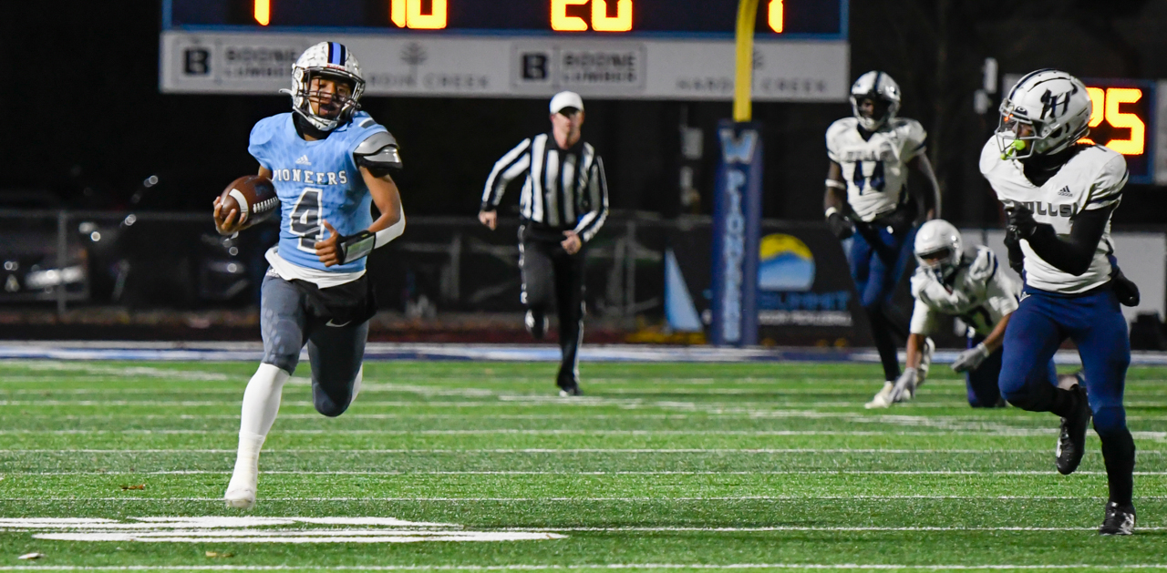 A good chunk of those came in the opening drive of the second half. Two plays into the drive, Leon burst through a gap carved out by the Pioneer offensive line and ripped off the Raging Bulls’ secondary for a 30-yard gain. On the very next play, he finished things off with a 38-yard ramble through the Hickory Ridge defense, his TD and quarterback Maddox Greene’s 2-point conversion giving the Pioneers a 27-20 lead they would never relinquish.