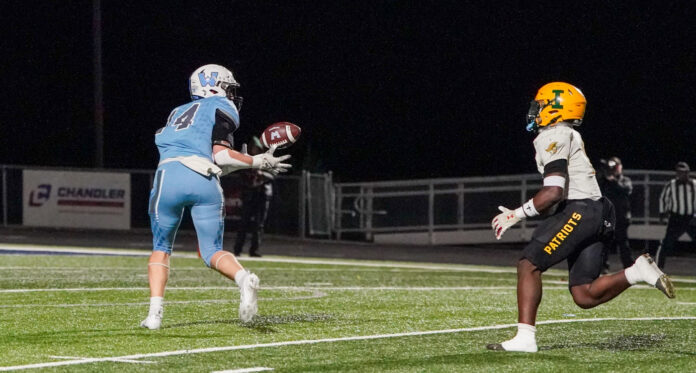 Perhaps because of the constant defensive pressure applied by the Patriots, but Watauga quarterback Maddox Greene arguably had an off night passing, completing just 11 of 23 passes for 145 yards and two TDs, offset by two interceptions. He did run for 100 yards on 13 carries, but Watauga rarely put themselves into position to capitalize. At least twice the Pioneers got the ball into the red zone and turned the ball over. Both of Greene’s TD passes were to senior WB/TE Morgan Henry, who hauled in three catches for 64 yards, two for TDs.
