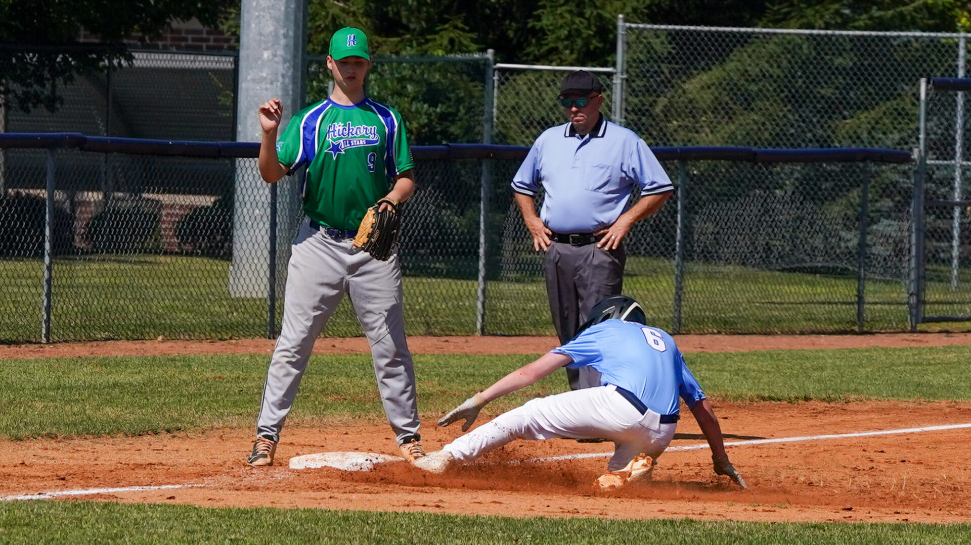Watauga’s Isaiah Shreve (6) slides into third base vs. Hickory in the July 13 Tar Heel League second round game. Photographic image by David Rogers