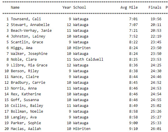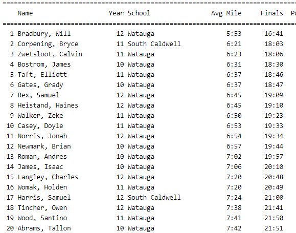 Pioneer senior Will Bradbury finished the 5000-meter run in 16:41 to top the field, with South Caldwell’s Bryce Corpening crossing the line in the No. 2 position (18:03). Watauga’s Calvin Zwetsloot, James Bostrom, Elliott Taft, Grady Gates, Samuel Rex, Haines Heistand, Zeke Walker, Doyle Casey, Jonah Norris, Brian Newmark, Andres Roman, Issac James, Charles Langley and Holden Womak rounded out the top 16.