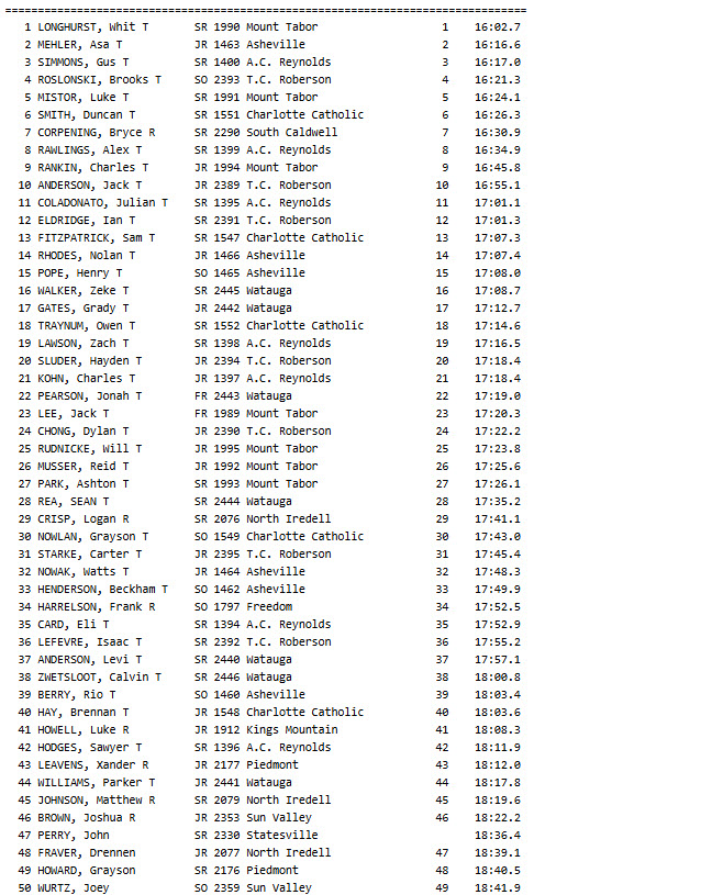 Whit Longhurst of Mount Tabor finished No. 1, his time of 16:02.7 almost 14 second ahead of the No. 2 competitor from Asheville, Asa Mehler (16:16.6).