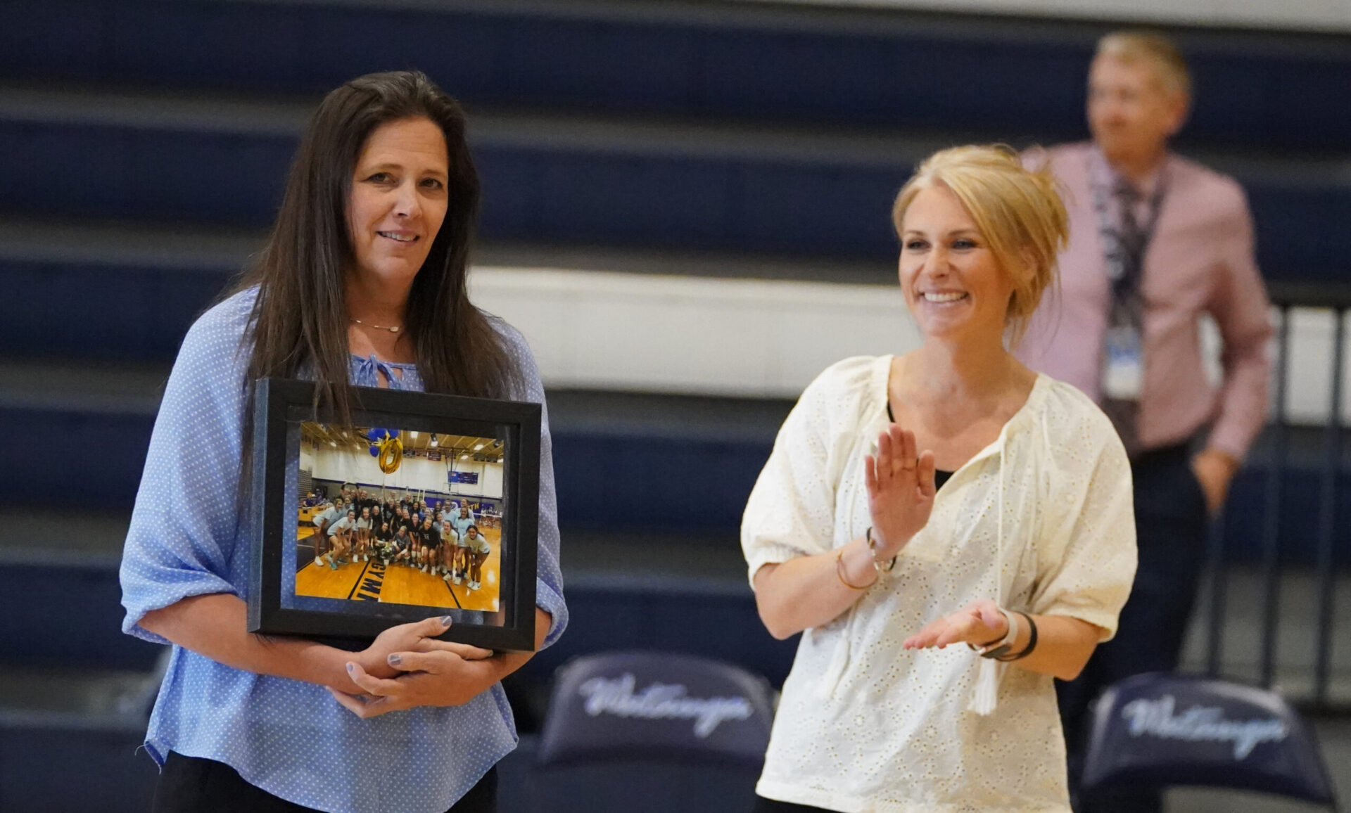 Before the match, assistant coach Casey Gragg, on behalf of the team and school, presented head coach Kim Pryor with a hi-res team photo embedded on a plaque to commemorate Pryor’s 200th win. She has coached many of the Watauga athletes since they were in grade school, at different levels.