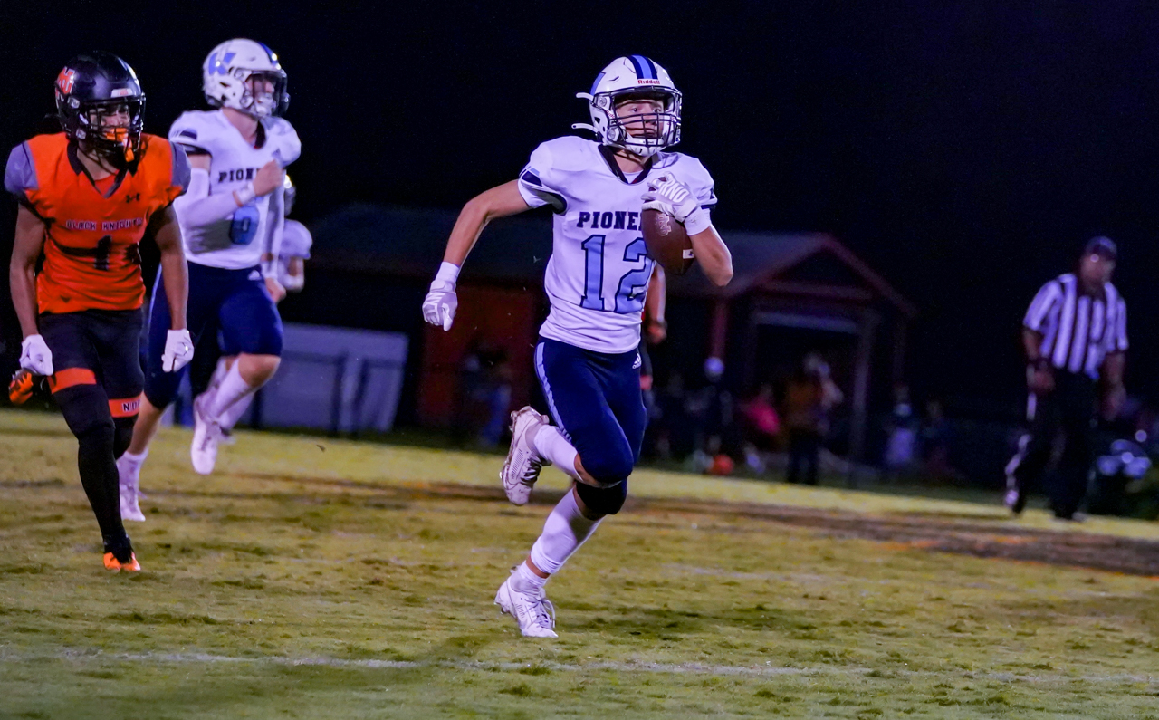 In fact, once Gryder dove across the goal line after an 18-yard jaunt to finish the Pioneers’ opening possession, the game was all but decided when North Davidson followed up with a 4-and-out, turnover on downs. On the first play from scrimmage upon Watauga taking possession for the second time, Greene raced 52 yards on a QB keeper over left tackle, weaving his way through and past would-be defenders until pushed out of bounds at the Black Knights’ 1-yard line. Greene’s yeoman effort got the ball close, then it was Gryder who plunged across the middle for his second TD — and the jousting had barely begun, barely midway in the first quarter.