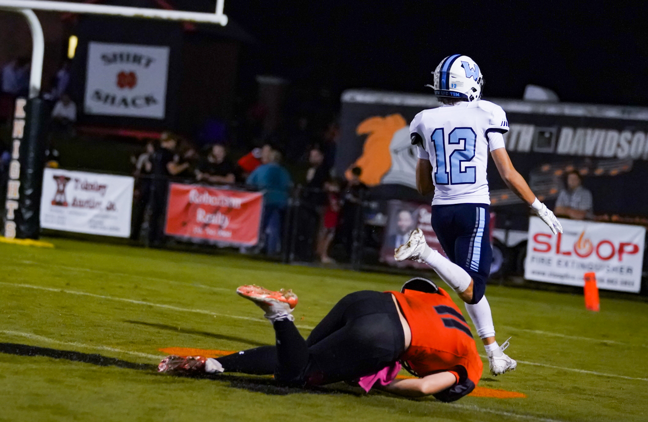 Burroughs effectively pulled that trigger just moments later when he intercepted yet another McMillan pass and returned it 45 yards before being tackled out of bounds at the North Davidson 20-yardline. After a big gain by teammate Ben Gosky put the ball at the ND 3-yardline, Burroughs got a chance to finish the job he had started, carrying the ball the final three yards for the TD. Another Wilson PAT kick, and the mercy rule was on, 49-7, with still roughly five minutes to go in the third quarter.