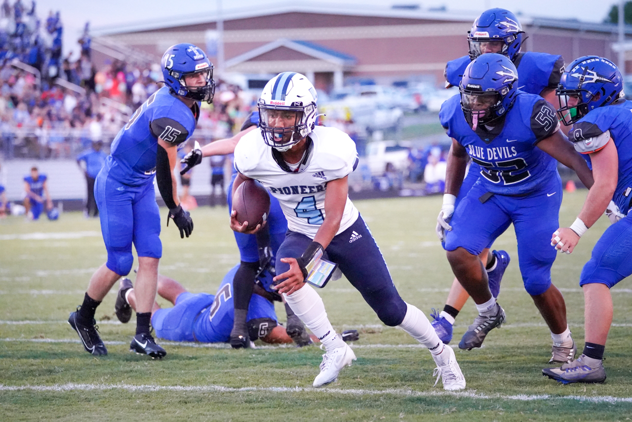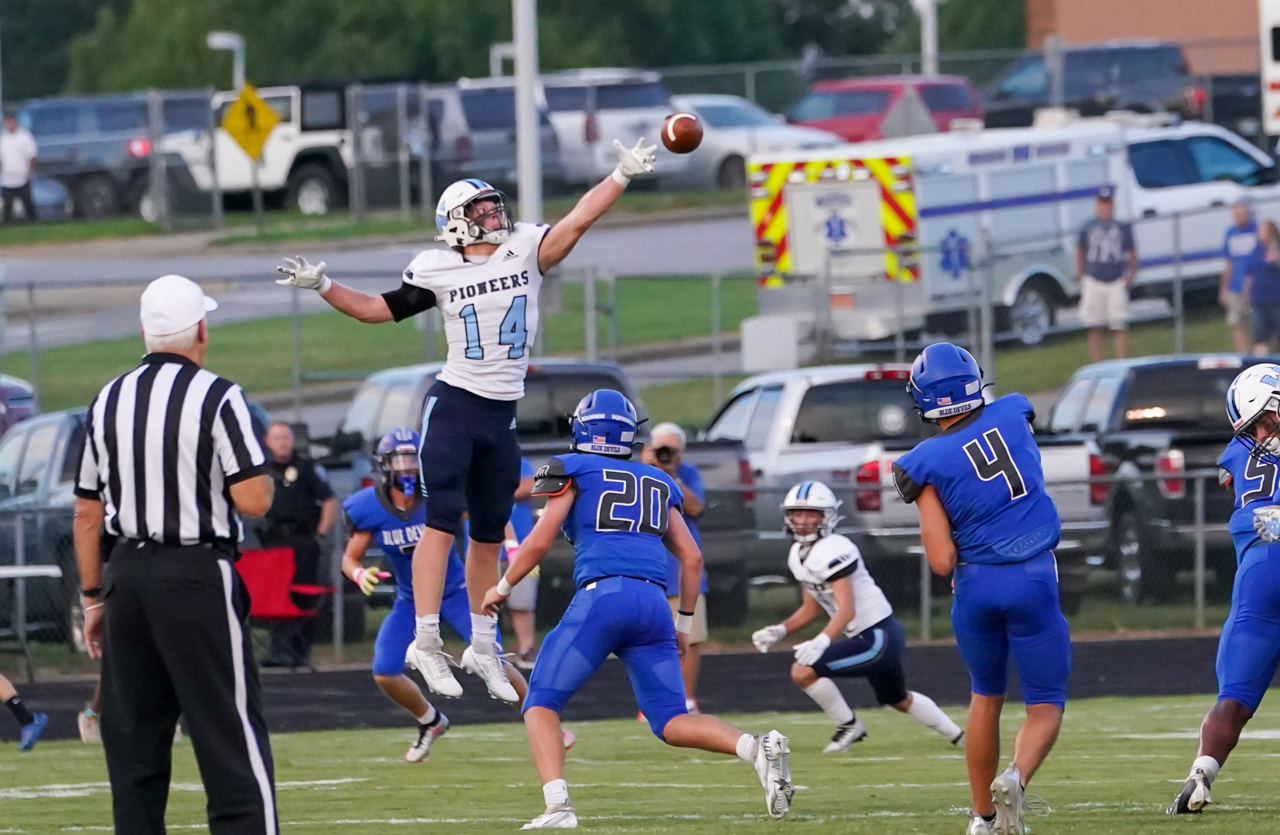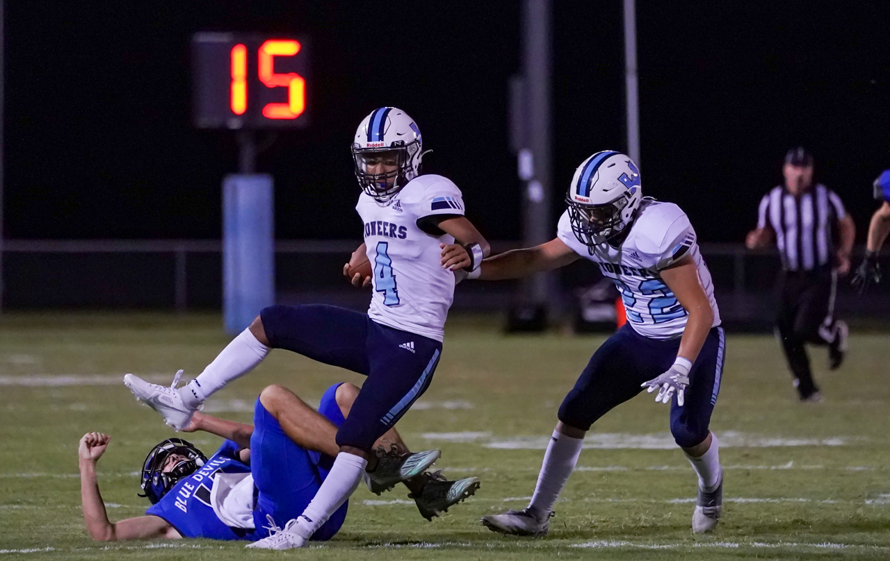 One of the defensive highlights of the Pioneers’ evening of work came in the second half when linebacker Carson Gunnell-Beck scooped up an errant Maiden lateral and ran the fumble recovery back 43 yards for a touchdown. His “scoop and score” extended the Pioneers’ advantage to 40-14, all but putting the game out of reach for the Blue Devils.