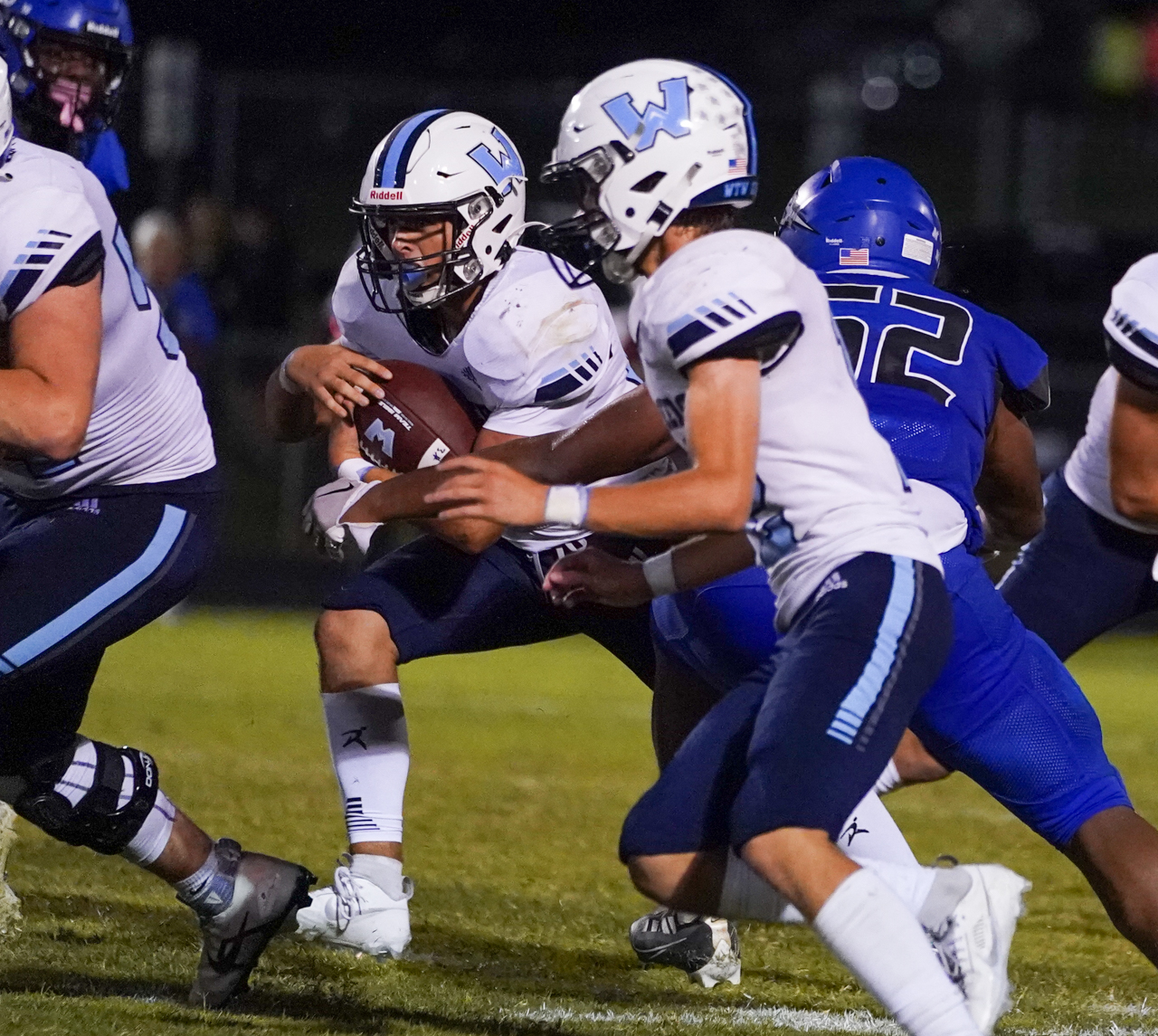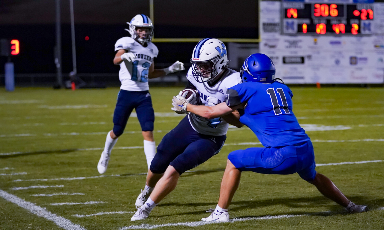 Sophomore B-back Everett Gryder is establishing himself as just the latest in a successive line of running backs groomed by head coach Ryan Habich and his staff. Gryder carried the ball 23 times as the workhorse running back in Habich’s run-oriented scheme, gaining 115 yards and pushing the ball across the goal line for two TDs.