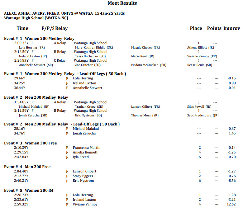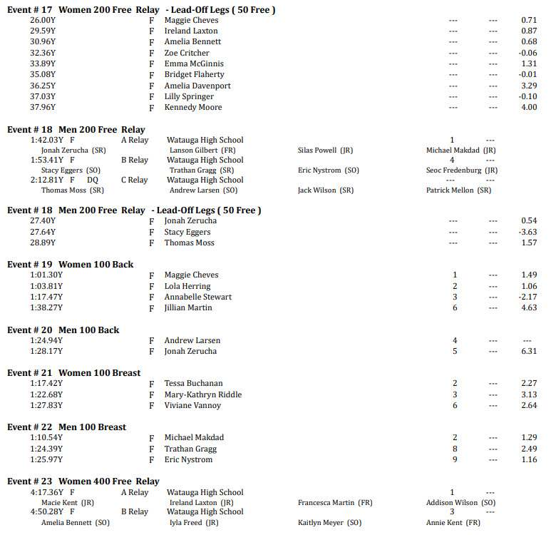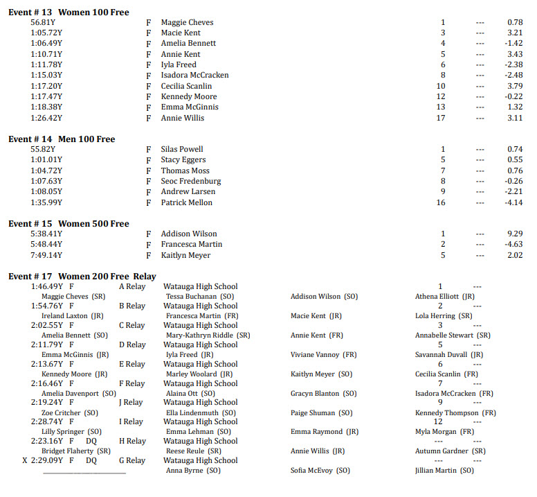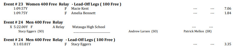 - In the longer distance, 400 Free Relay event, Watauga had two entries, finishing No. 1 and No. 3. The first place team was comprised of junior Macie Kent, junior Ireland Laxton, freshman Francesca Martin and sophomore Addison Wilson.