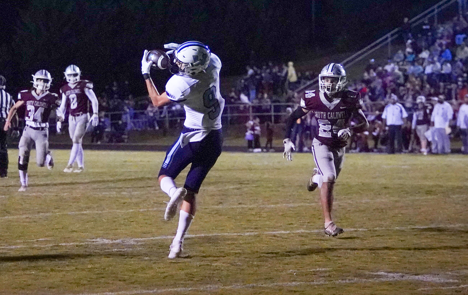 South Caldwell finally got on the scoreboard still early in the second quarter on a 7-play drive that advanced the ball from the SC 29 to the end zone, aided by a 15-yard “roughing the passer” penalty, but the TD scamper by Sylas Scruggs and the PAT kick by Andrew Pruette would prove all the Spartans could manage in terms of scoring for the rest of the night.